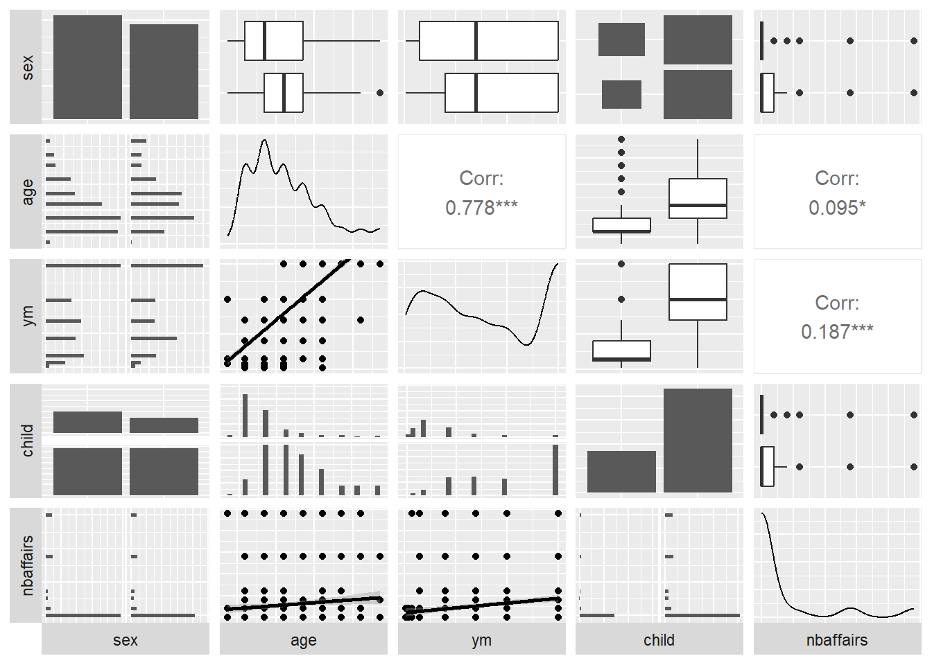 Here’s another dataset, the Fair (marital affairs) data, which is also included in the Ecdat package. You should read a little about it in the help window before proceeding.