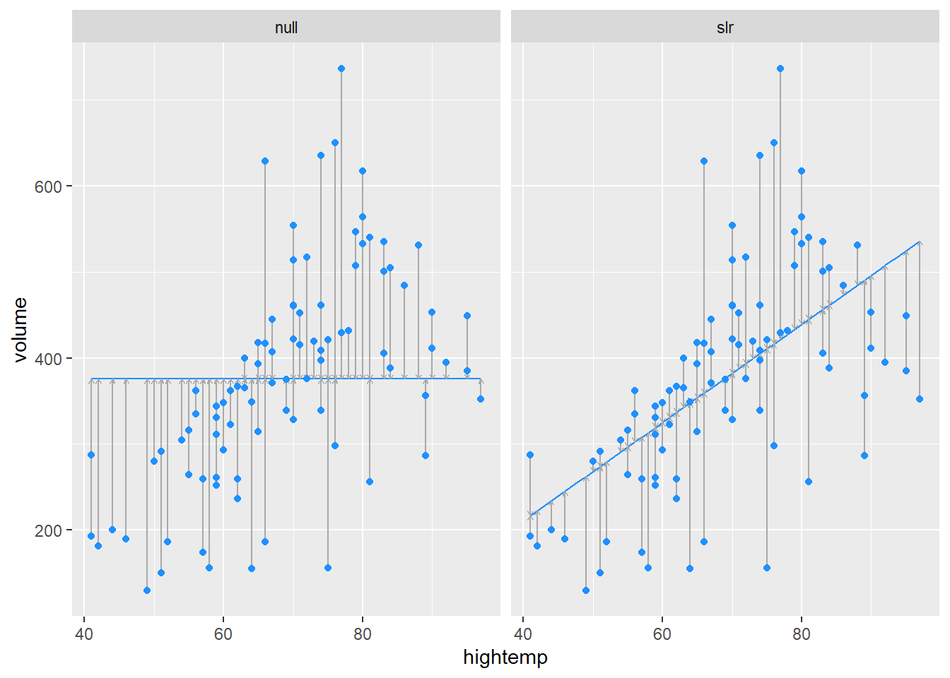 each = nrow(RailTrail)))In each plot, the vertical lines show our errors of prediction around the regression line (which is flat for the null model).