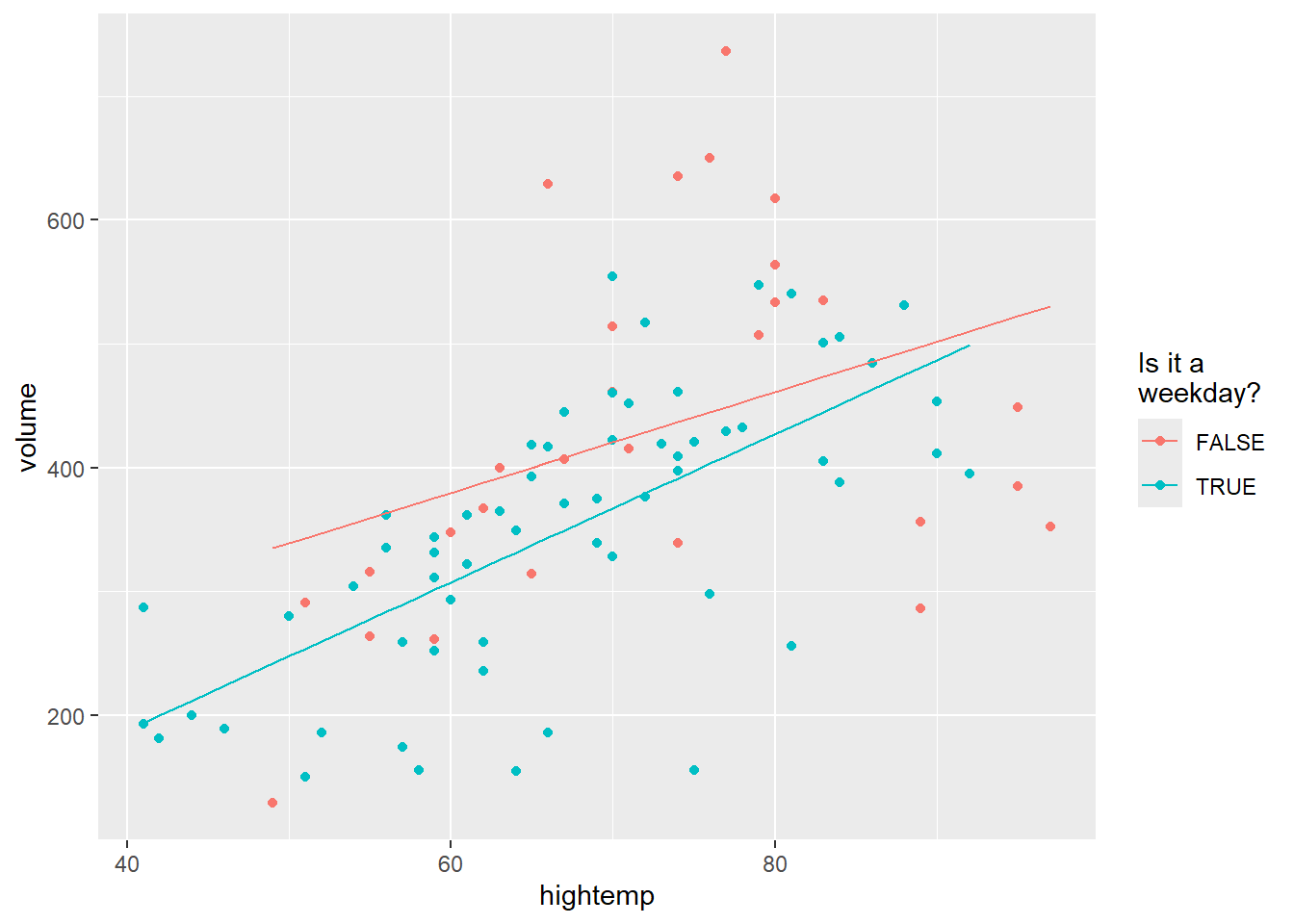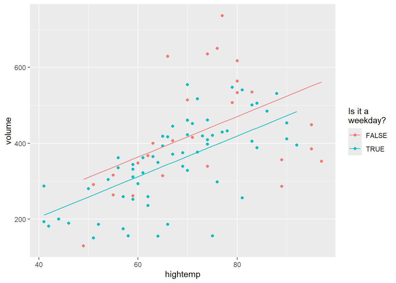 mod_parallel <- lm(volume ~ hightemp + weekday, data = RailTrail)